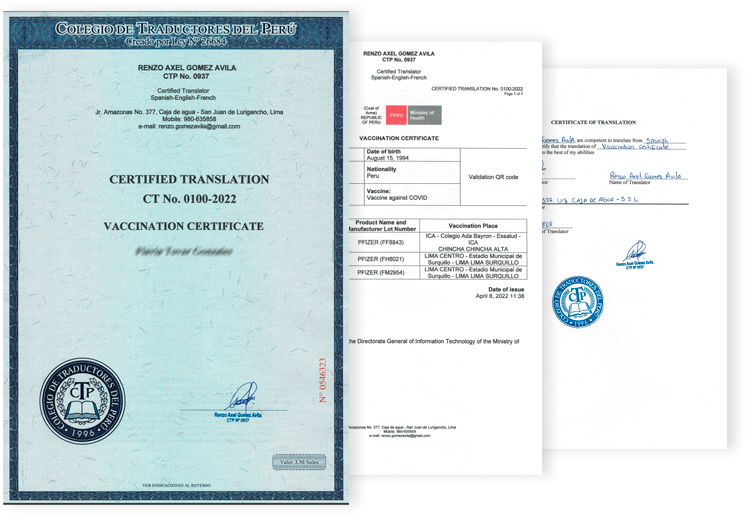 Las traducciones certificadas físicas son avaladas por el Colegio de Traductores del Perú (CTP), esta es entregada con una carátula especial diseñada por el mismo CTP, la traducción es impresa en hoja A4, firmada, sellada y membretada con los datos del/de la Traductor(a) Colegiado(a) Certificado(a), otorgándole una validez legal para su uso a nivel nacional como internacional. En TRANZLATE nos distinguimos no sólo por nuestros conocimientos y experiencia, sino también por nuestra motivación, pasión y compromiso en responder a las exigencias específicas de cada cliente